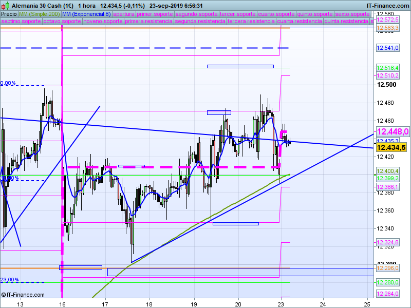 Si bajamos a gráficos de H1, como cada inicio de semana, debemos fijarnos en el precio de apertura semanal (PAS), que lo tenemos en 12448. Tras una apertura con un ligero GAP alcista, el escenario alcista que planteamos en el anterior párrafo tiene sentido mientras veamos al precio ir cerrando velas por encima del PAS. En este caso, nos vamos a seguir fijando en los objetivos marcados durante la semana pasada: el SOR mensual en 12518, precio de apertura trimestral en 12541 y finalmente SOR anual en 12563.