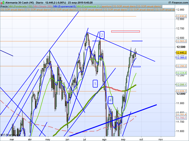 Que sea el escenario más probable no quiere decir que sea el único. Seguimos manteniendo opciones para una continuidad impulsiva bajista mientras no se superen los máximos de Julio, para activar este escenario deberíamos esperar a ver cierres por debajo del SOR 12296.