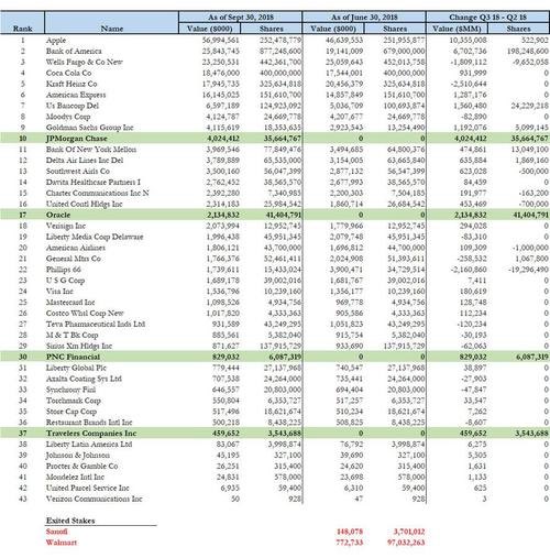 Al cierre del tercer trimestre del 2018, las posiciones que mantiene Buffet en Berkshire son las siguientes. Destacan las entradas de JPMorgan, Oracle, PNC Financials y Travelers Companies Inc. Ya sabeis, correcciones para comprar.