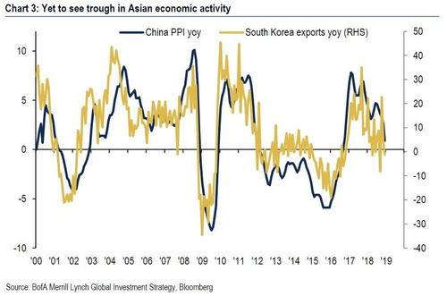 Uno de los indicadores clave para medir la salud de los mercados es el dato exportador de Corea del Sur, aquí dejamos un gráfico de Bank Of America en el que vemos su evolución junto con el indice de precios de producción de China. Dos variables importantísimas para comprender el estado de la economía.