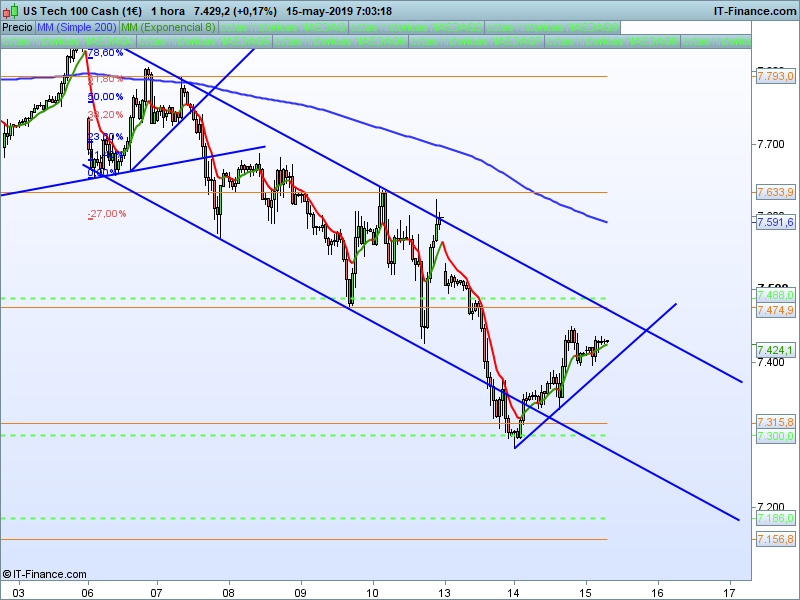En este caso también nos quedamos por debajo del SOR de referencia, el 7475, mientras estemos por debajo mantendremos predisposición bajista con un primer objetivo en 7315.