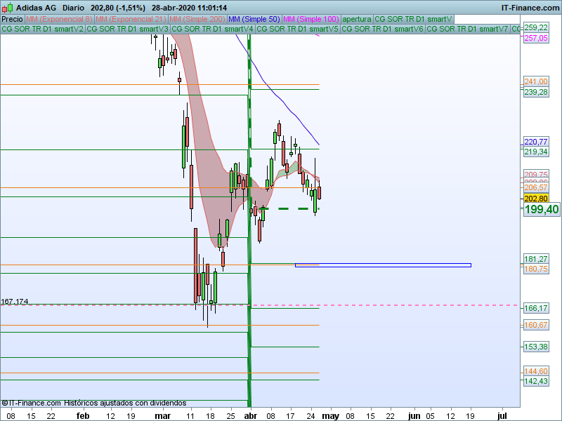 ADIDAS. Posible escenario operativo en corto. Publicado por Julio Fdezel 28 abril, 2020Credit Suisse recomienda vender, la pérdida del PAT (199.40) podría activar el lado corto hasta 181.50.Seguir leyendoArtículo anterior Banco Santander. Esperar hasta recuperar el PATArtículo siguiente TRADING LIVE 11.30. Tirón al alza para confirmar escenario del día.