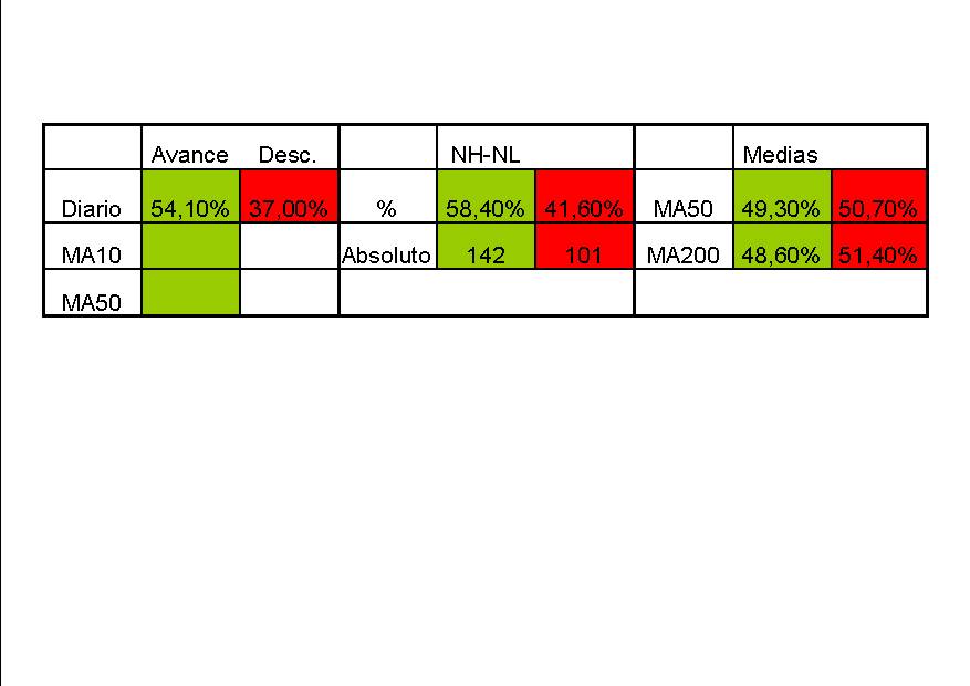 A partir de hoy añadimos a nuestros análisis diarios un básico esquema de amplitud de mercado. En él, podremos ver de forma muy rápida cómo se están comportando diariamente los valores americanos en base a los siguientes conceptos: