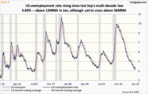 Siguiendo con el enfoque macro, ya saben que el dato del empleo es el gran bastión que le queda a EE.UU para apuntalar la maltrecha confianza inversora. En el tercer trimestre de 2018 se hizo un mínimo en la tasa de desempleo del 3.69%, desde entonces hemos subido hasta el 4% cortando al alza la media de 12 meses, pueden ver lo que pasa cuando esto ocurre en este gráfico de hedgopia.com