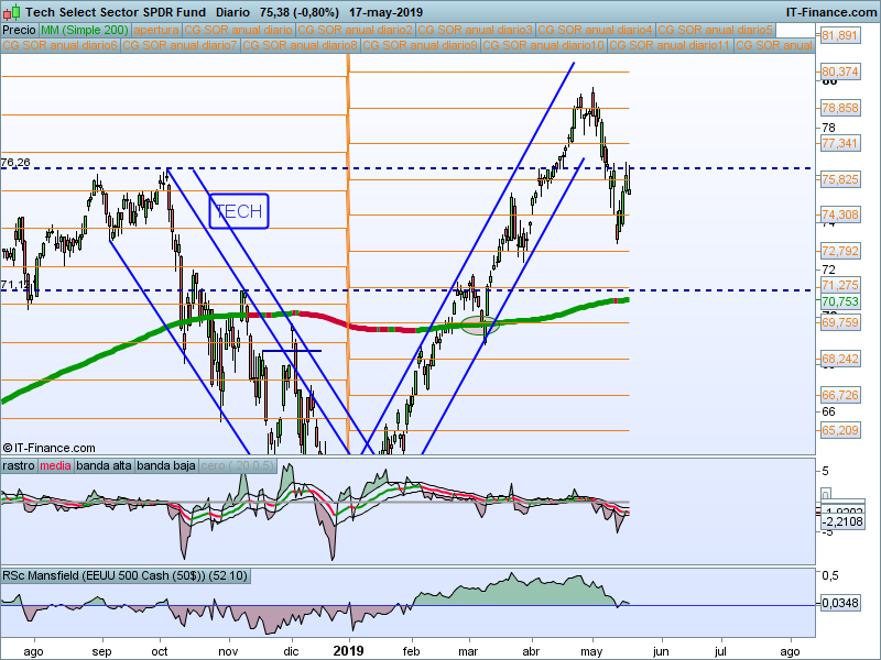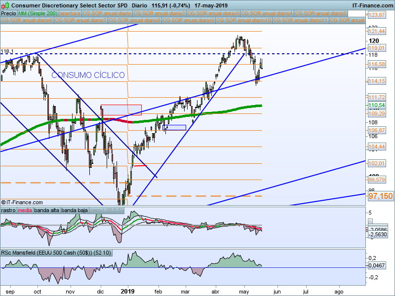 3.-Sectores directores en EE.UU.- Los sectores que con más ganas han tirado durante este tramo alcista en el 2019 en EE.UU han sido el sector tecnológico y el sector consumo cíclico. Ambos han visto nuevos máximos históricos, sin embargo, durante estos días hemos visto perder el soporte formado por el anterior máximo de 2018. El movimiento del viernes fue de test a esos niveles, para cerrar en mínimos en ambos casos. Esto lo pudimos ver la pasada semana en el análisis sectorial que compartimos en serenitymarkets.com