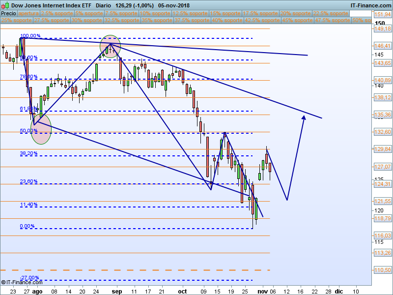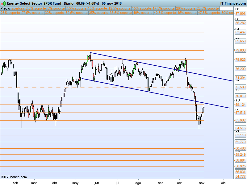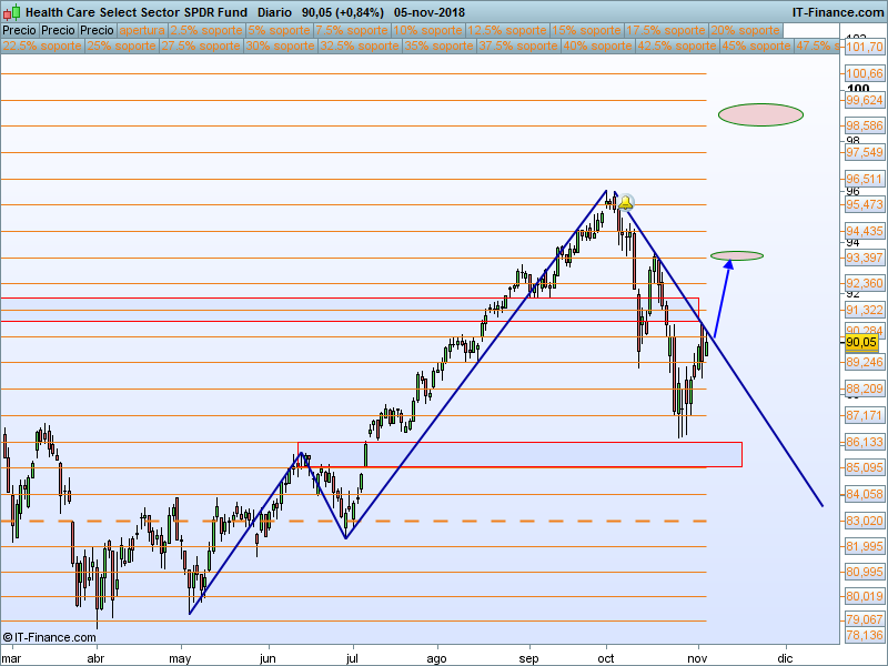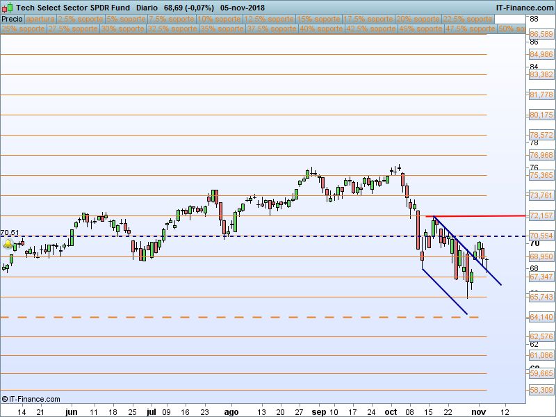 Tech (XLK).- En este caso pensamos que la caida con mínimos del 29 de octubre puede ser una A en abc, es probable que veamos un recorrido alcista para completar la B, pero ojo al comportamiento del precio en la zona marcada con linea roja y que coincide con SOR 72.157.