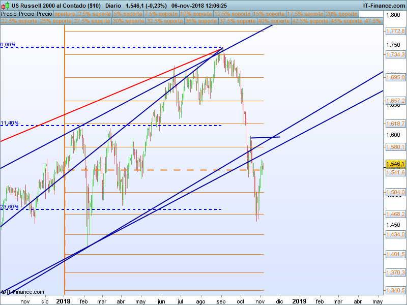 Small&Med Cap (Russell 2000).- Si nos fijamos, ha rebotado en el 23,6% de la última gran subida, lo que nos indica que debe seguir bajando, podríamos estar en la formación de una onda B, pero no tenemos confirmación estructural. Eso si, el precio se ha pegado al PAA. De momento estamos fuera.