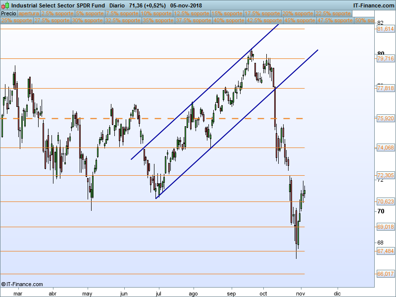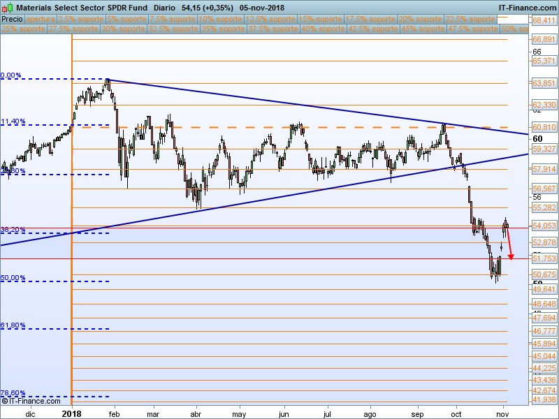 Materiales básicos (XLB).- Rebotó en la zona del 50 del retroceso del impulso alcista que traía desde inicios de 2016. No es de nuestros preferidos, no ha roto con firmeza el último máximo relevante… que tampoco fue muy relevante.