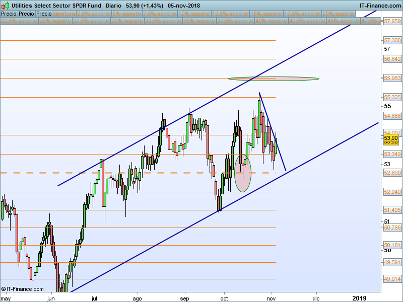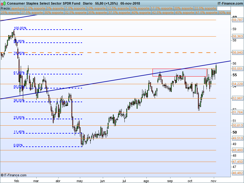 Consumo Básico (XLP).- Sigue teniendo un buen comportamiento, casi diríamos que el mejor de los sectores, aún así la LT alcista que traemos desde 2016 está haciendo de resistencia móvil. Disiparíamos todas las dudas con cierres por encima del PAA.