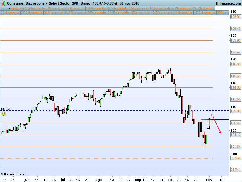 Consumo cíclico (XLY). HA sido rechazado por un SOR importante, el 109.08. Cierres por encima de este nivel nos pueden avisar de la formación de un suelo.