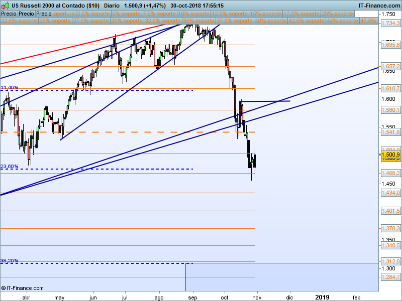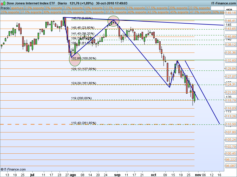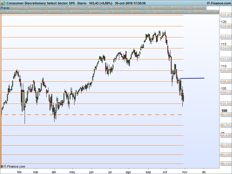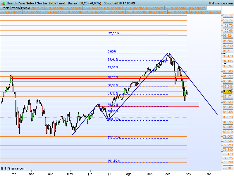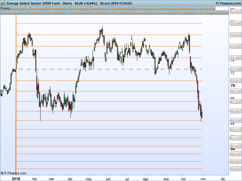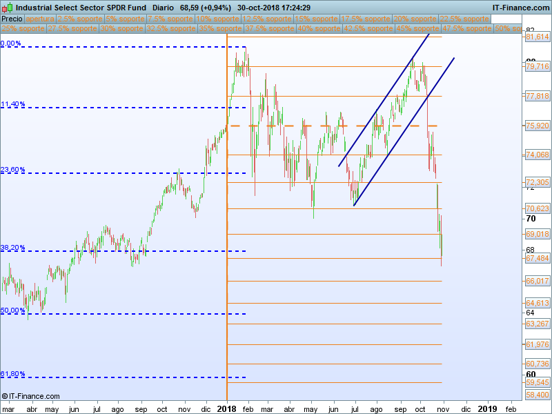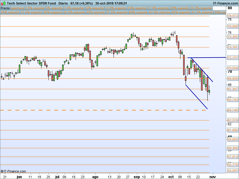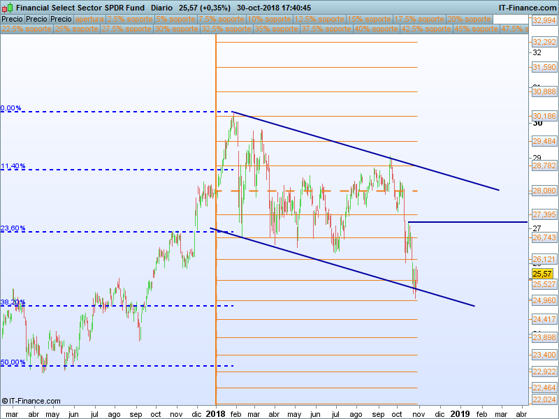 Financiero (XLF).- Ya era uno de los sectores más débiles del año antes del «octubre rojo». Estamos en la parte baja del canal, si somos capaces de aguantar los mínimos, se podría intentar un rebote desde este punto.
