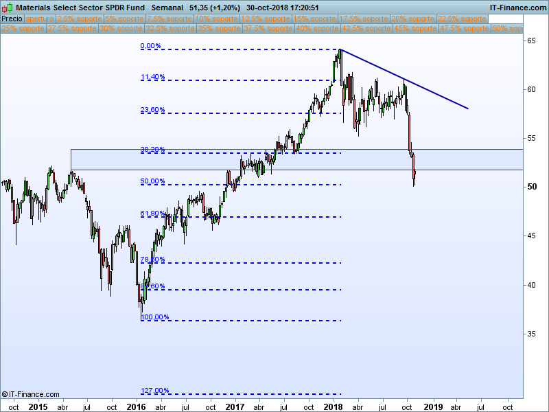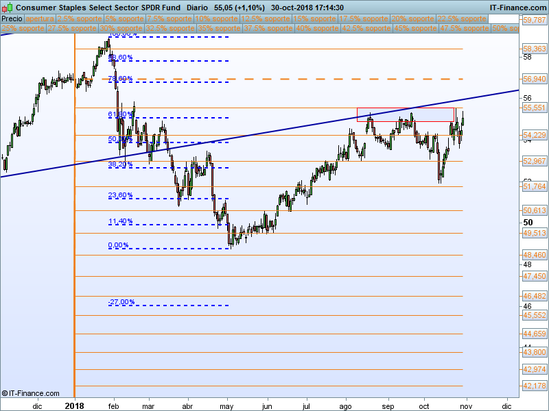 Consumo básico (XLP).- Se sigue comportando mucho mejor que la gran mayoría de los sectores y está aguantando las tensiones bajistas de las bolsas muy bien, sector defensivo donde los haya. El SOR 55.551 ha frenado el avance del precio 4 veces este año, la perforación de este nivel nos llevaría muy probablemente al PAA en 56.94.