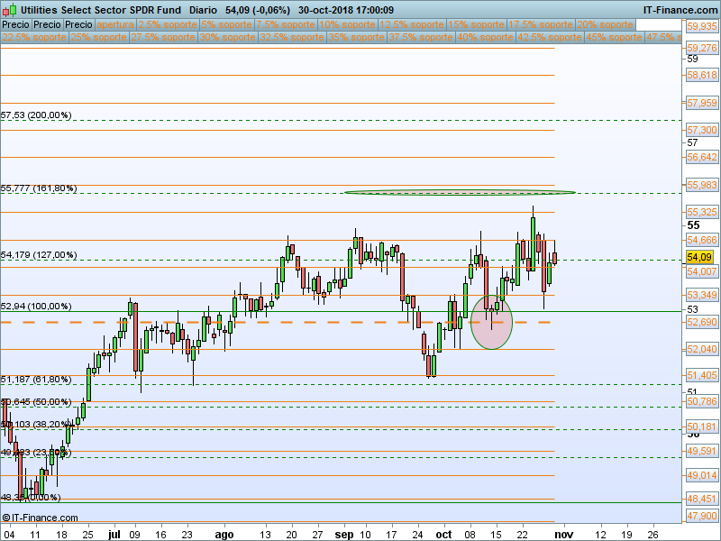 Utilities (XLU).- Nos hemos quedado muy cerca del objetivo propuesto, el SOR 55.325 no nos ha dejado pasar. Pero a pesar de todo la estructura se mantiene alcista. Solo la pérdida del PAA nos hará cambiar nuestra predisposición.