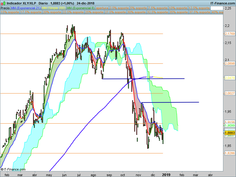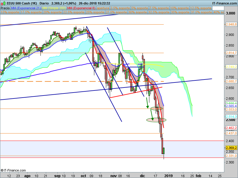 Si lo miramos bien, podemos comprobar una doble divergencia entre índice y spread. En noviembre, el SP500 no perforó los mínimos de octubre, mientras que el spread si lo hizo. El desenlace de esta primera divergencia ya la conocemos. La segunda divergencia nos muestra que mientras el SP500 cae a plomo en diciembre, el spread (de momento) mantiene los mínimos de Noviembre. ¿Estaremos cerca de ver una corrección de mayor calado dentro de los índices?
