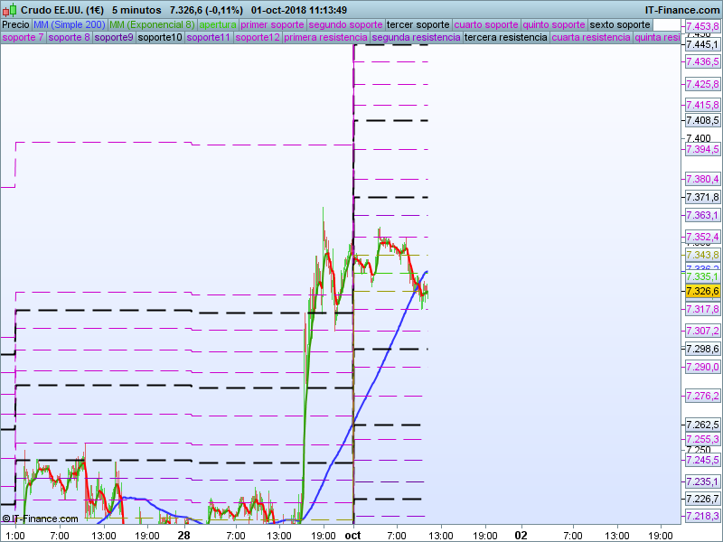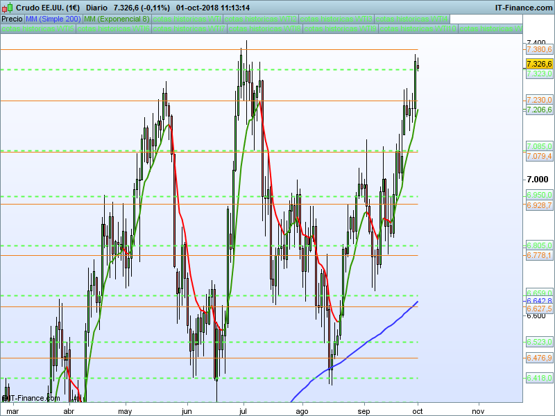 Crudo ligero WTI, 11:11:03.- Y al quinto dia rompimos con fuerza el SOR anual 7230, cerrando por encima del refugio 73.23. El SOR anual 73.80 debe marcarnos la referencia.