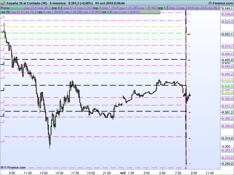 Ibex 35,08:29:59.Por un momento vimos como el SOR anual 9379 lo paró, fue en el momento en el que sacamos nuestro análisis de “urgencia” el pasado viernes. Pero en lo que restaba de sesión se perdió con claridad ese nivel. Esta cota debe ser nuestra bisagra, cierres por encima pueden dar lugar a un rebote (teniendo en cuenta que pararon al precio en el 61.8% del último impulso alcista). Cierres por debajo del 9354 nos deben abrir paso hacia los niveles 9278, 9212 y 9165.