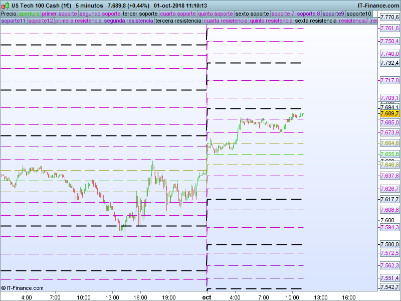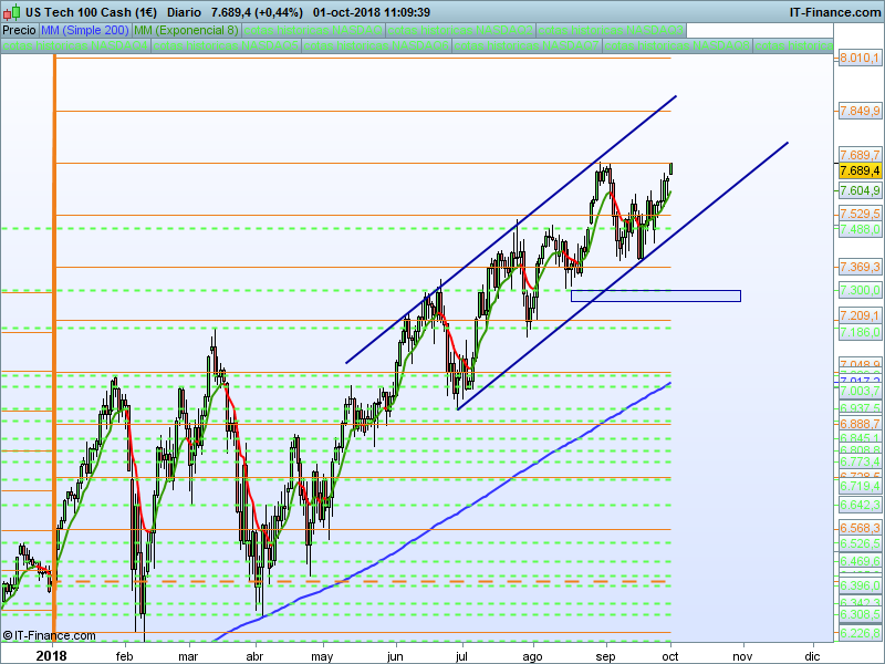 NASDAQ100, 11:08:45.- Tras varios días mostrando comportamiento divergente, vuelve a zona de máximos. Cierres por encima de los máximos anteriores deben hacernos pensar en nuevo tramo hasta 7849.