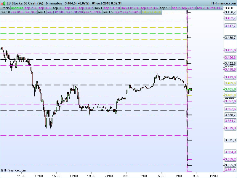 EUSTOXX 50.08:31:45.- Cierre claro y contundente por debajo del SOR anual 3417 y del refugio 3407. Debemos pensar en corrección hasta los 3345-3336 mientras sigamos teniendo cierres por debajo de los niveles indicados.