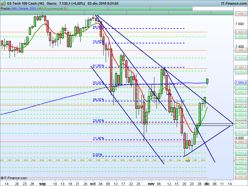 NASDAQ100,08:20:08.- El objetivo sería alcanzar el SOR 7209, que además coincide con el retroceso del 61.8% de toda la bajada iniciada en octubre.