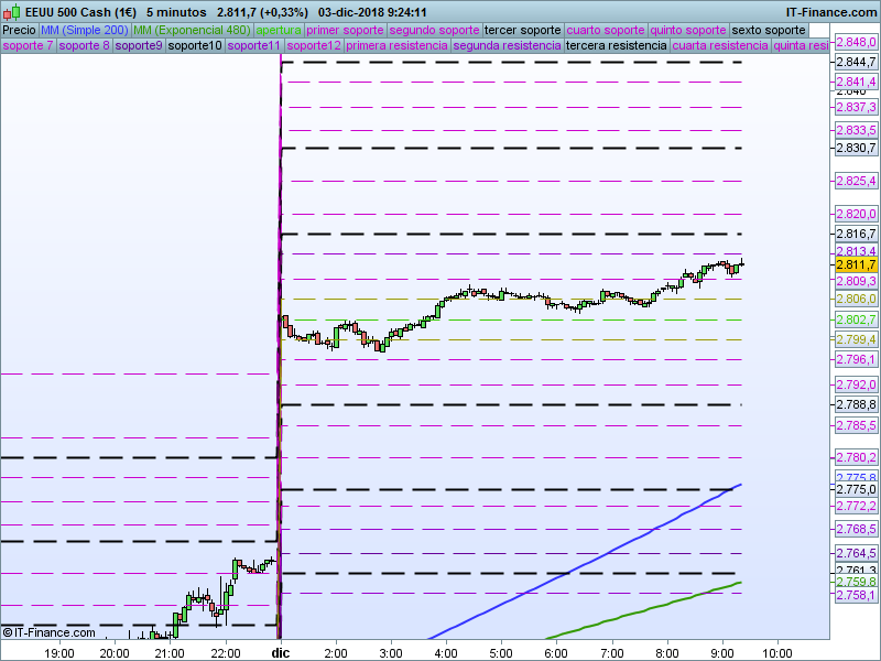 SP500,08:18:23.- GAP por encima de 2800 y que nos pone rumbo al SOR 2814. En ese punto hay altas probabilidades de corrección y retesteo a la media de 200 para cerrar el GAP.