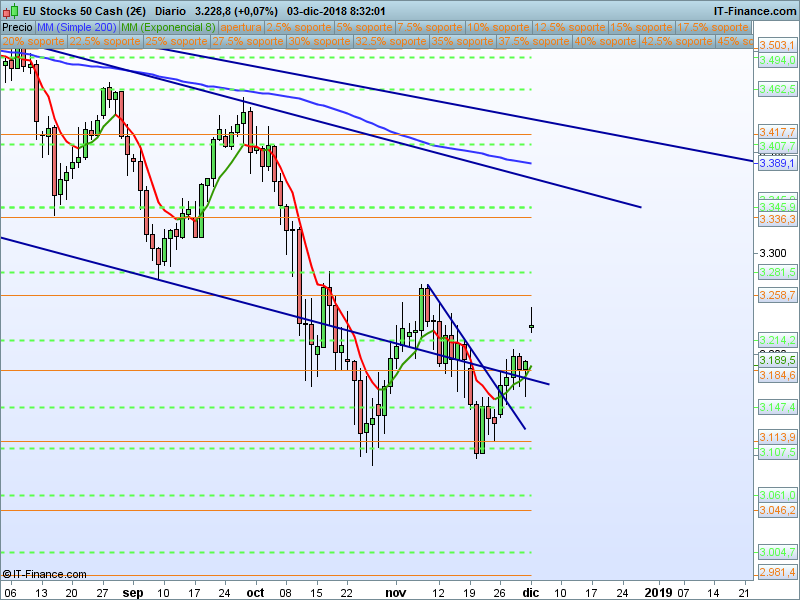 STOXX50,08:30:19.- Si durante días nos hemos ido fijando en el SOR 3184, ahora vamos a mantener nuestra predisposición alcista mientras permanezcamos por encima de esta cota. Estamos muy cerca del próximo objetivo, el SOR 3258