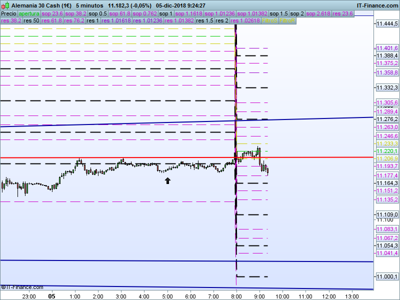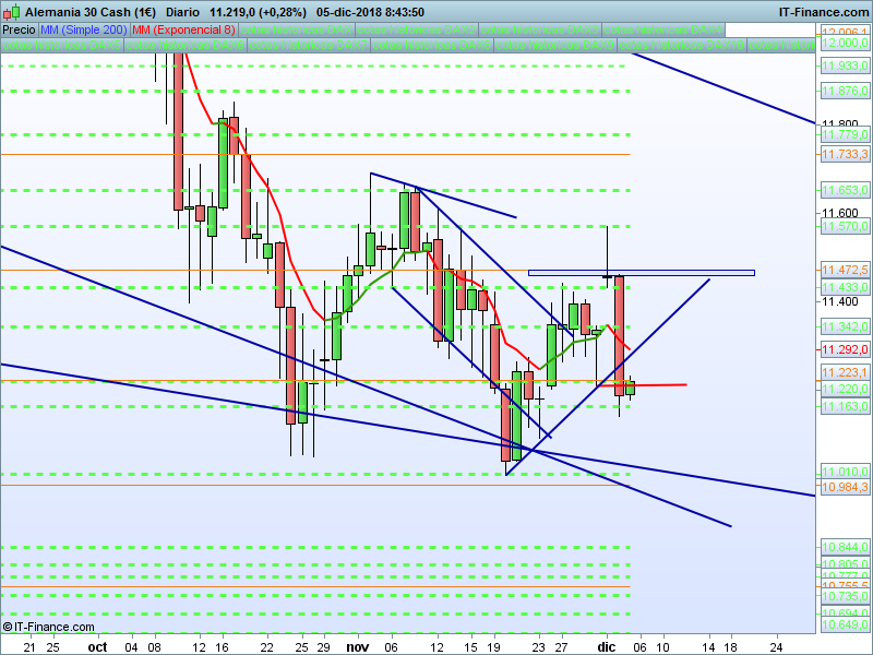 DAX Xetra,08:42:12.- El escenario planteado ayer no llegó a producirse, el precio cayó a plomo cerrando por debajo del nivel 11223 donde confluyen SOR anual y refugio. Mientras estemos por debajo de este nivel, la predisposición es ir a visitar de nuevo zona de mínimos.