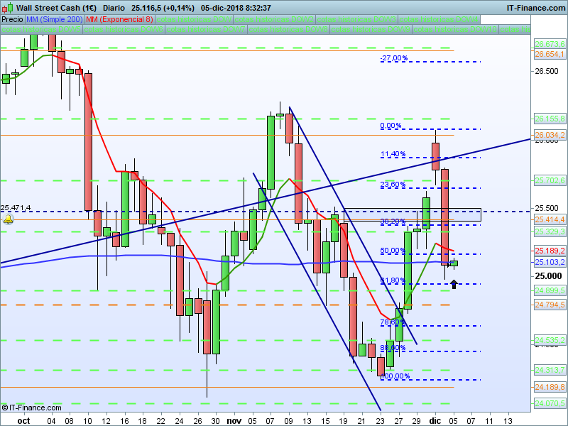 DOW JONES,08:29:08.- La vela dejada ayer es muy significativa. Nos hemos ido a tocar de nuevo a la media de 200 sesiones. Los niveles a vigilar ahora son el 25414 y el PAA 24794. Cierres por debajo de este tendrá implicaciones bajistas de nuevos mínimos.