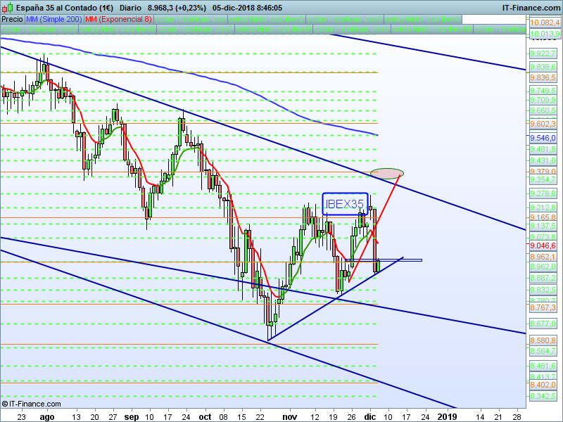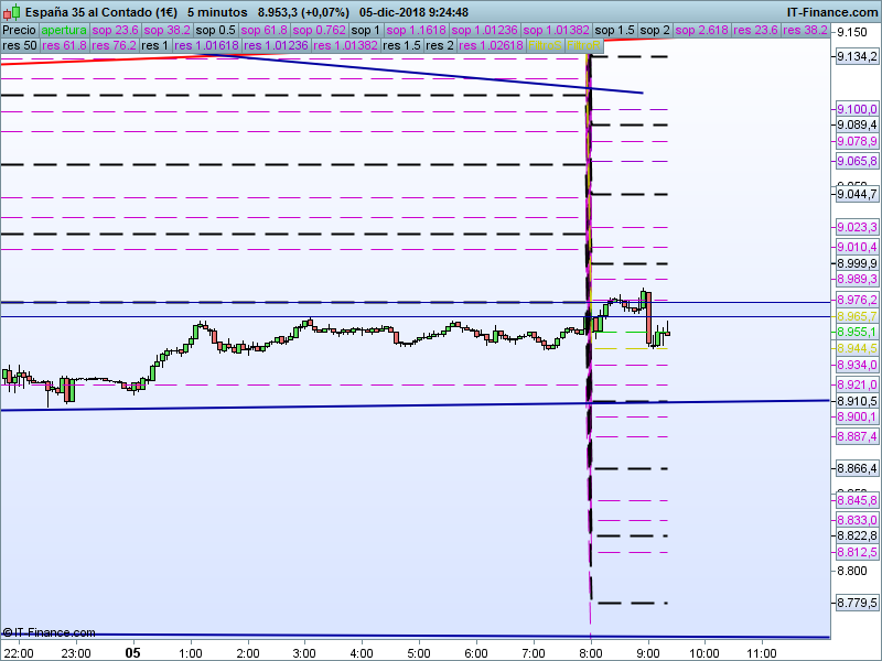 IBEX35,08:44:12. – La vela de ayer fue muy fea de cara a las implicaciones alcistas que traíamos. Cierre por debajo del importante nivel 8962 y habría que vigilar la posible ruptura de la LT alcista de muy corto plazo.