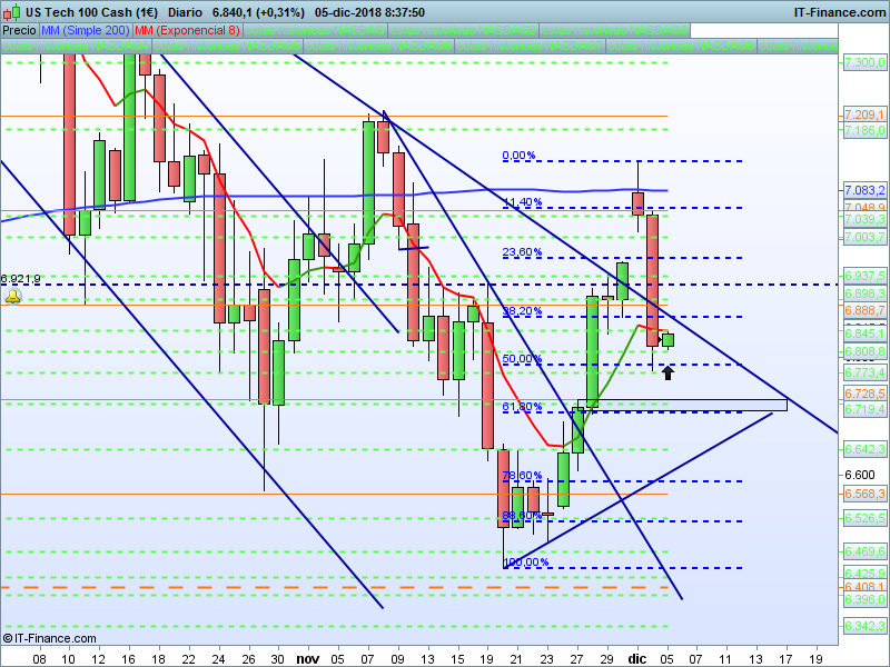 NASDAQ100,08:35:31.- Ya venimos comentando que la estructura de este índice es diferente, el descenso tiene menor profundidad. La zona clave mientras permanezcamos por debajo de 6888 es el 6728. En ese punto debemos ver la reacción del precio.