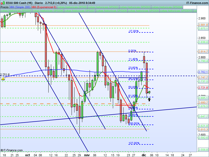SP500,08:33:42.- Pérdida con fuerza de la media de 200 sesiones y SOR 2747. El retroceso se ha parado en el 61.8 del último impulso, en el refugio 2695. El PAA en 2680 tiene la clave.