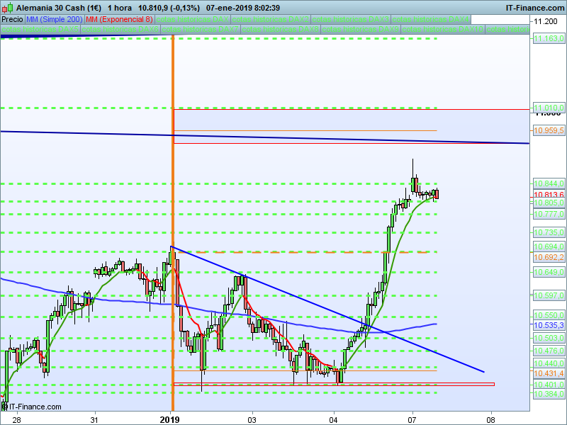 DAX Xetra,07:59:22.- Alcanzamos el objetivo del PAA con mucha facilidad y nos hemos ido hasta el refugio 10844, desde ese punto hasta el SOR 10959 deberíamos tener el camino despejado. Dado que hemos avanzado bastante desde el PAA, vamos a fijarnos en la EMA8 para controlar el movimiento.
