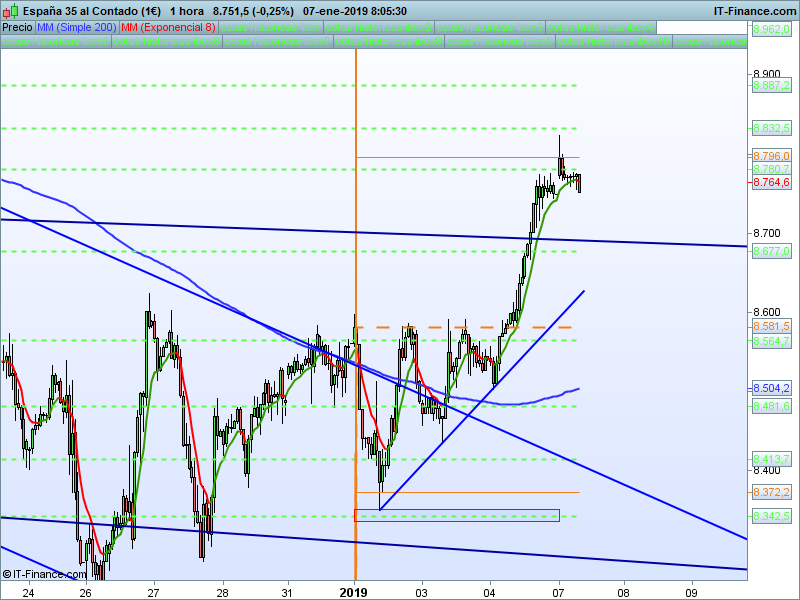 IBEX35,08:03:27.- No diga Ibex, diga Bingo. Fuera de bromas, el refugio 8677 no fue ningún impedimento para que el precio alcanzase el SOR 8796 durante la sesión asiática. Mientras permanezcamos por debajo, zona de lateralización donde podríamos venir a buscar el citado refugio para volver a tomar apoyos.
