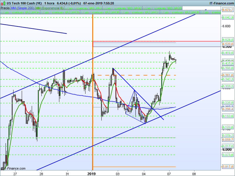 NASDAQ100,07:52:16.- Tuvo un desempeño mucho más alcista que el resto, llegando al refugio 6469, último escollo antes del SOR 6520. Este punto representa el retroceso del 61.8% del impulso bajista finalizado el 26 de diciembre y eso podría causarnos rechazo. Mientras estemos por encima de la EMA8 continuamos con predisposición alcista a corto plazo para buscar el 6520.
