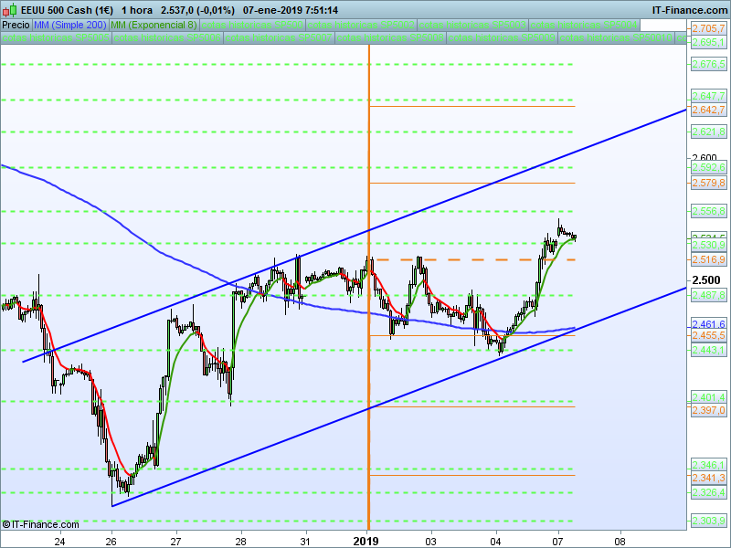 SP500,07:49:19- Tuvo más fuerza y fue capaz de estirarse hasta el refugio 2530, mientras nos mantengamos por encima del PAA 2516, lo probable sería buscar el siguiente SOR objetivo en 2579.