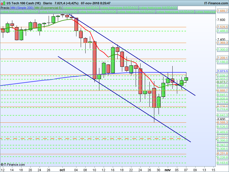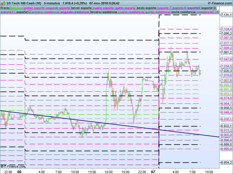 NASDAQ100,08:23:21.- Ayer tuvo un comportamiento más irregular, pero dentro de este movimiento intradía parece que dibujó una plana para terminar lejos de máximos. El posterior movimiento en la sesión asiática parece confirmarlo. El canal ha sido perforado, pero aún seguimos por debajo de la doble resistencia formada por la media de 200 sesiones y el doble SOR 7043.