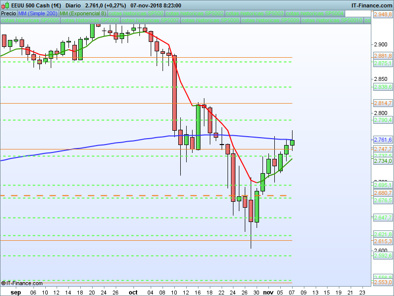 SP500,08:21:47.- La media de 200 sesiones sigue frenando la cotización, aunque ayer tuvimos cierre por encima de 2747. Esta es la zona a vigilar para poder considerar la posible formación de un suelo.