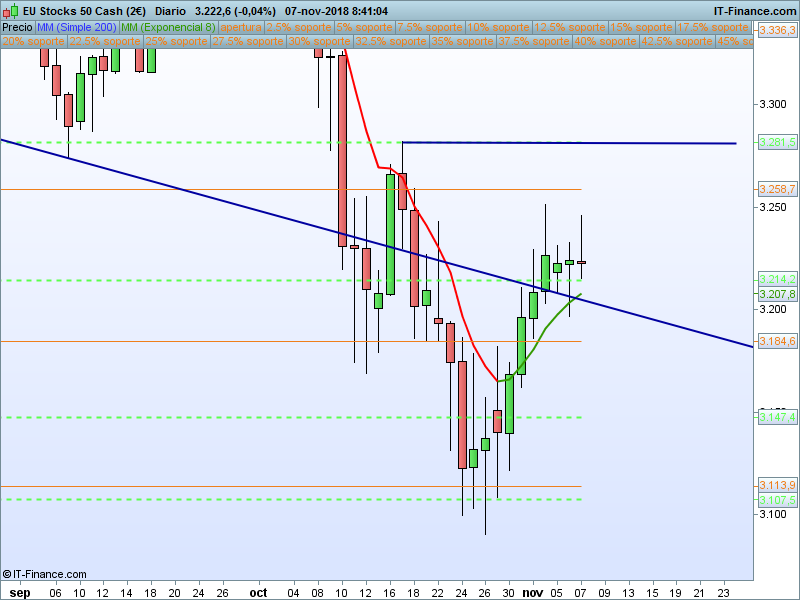 STOXX50,08:40:37.- Si vemos la vela de ayer y la que tenemos en formación en el día de hoy muestra una clara indecisión de figura correctiva. Estamos justo entre los dos SORs anuales.
