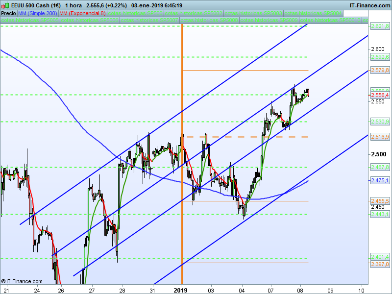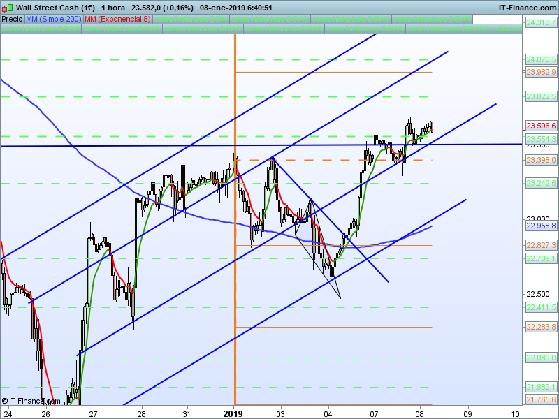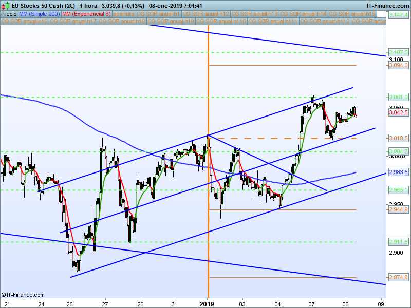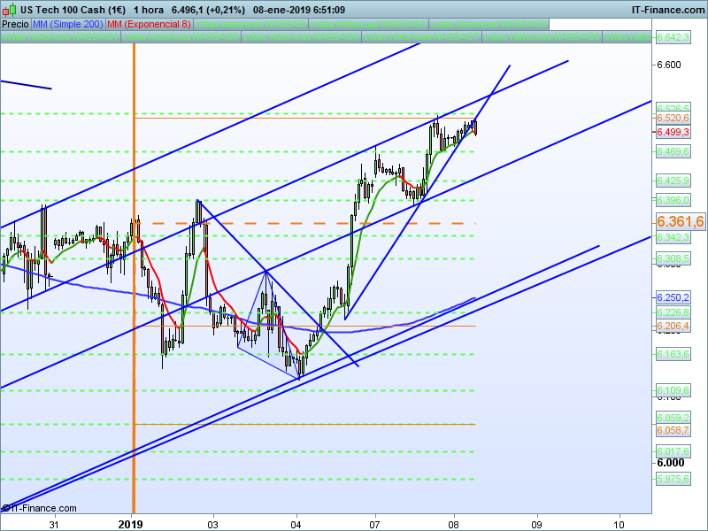 2019-01-08 APERTURA GLOBAL.06:30:19.- Comienzo de la semana alcista en Wall Street con un leve descenso de la volatilidad. Los escenarios planteados siguen abiertos, aunque hay que destacar que el Nasdaq100 ya ha cubierto su primer recorrido, apoyado en Amazon y en Netflix.