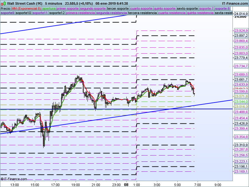 DOW JONES,06:38:38.-Día de altibajos para quedarnos prácticamente en el mismo sitio. Mientras estemos por encima del PAA 23398 la predisposición sigue siendo alcista con objetivo 23982. A muy corto plazo nos vamos a fijar en la reacción que tenga el precio en el refugio 23554.