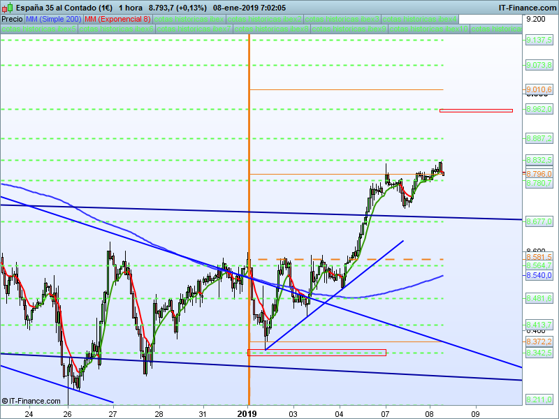 IBEX35,06:59:19.- Sigue mostrando más fuerza y se giró al alza antes de llegar al refugio 8677. En estos momentos se sitúa por encima del SOR 8796 y ese debe ser nuestro eje de referencia. Mientras se mantenga por encima debemos mantener predisposición alcista a muy corto plazo. El refugio 8962 tiene una especial relevancia.