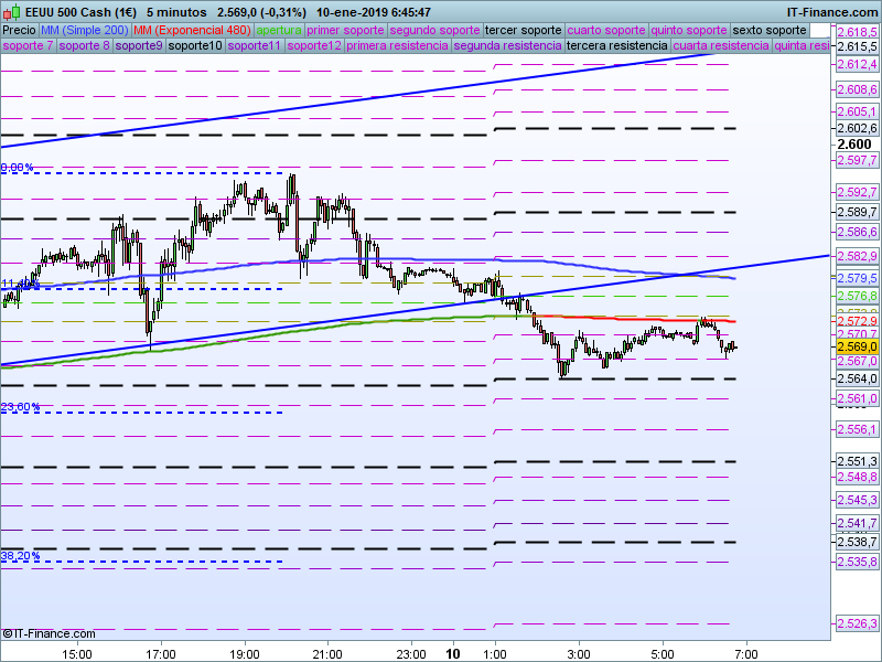 SP500,06:41:32- Durante la sesión de ayer tuvimos una pequeña excursión que nos llevó al refugio 2592. En el momento en el que el DJI alcanzo su objetivo, el SP500 se giró situándose en estos momentos por debajo del SOR 2579. Mientras estemos por debajo nos vamos a plantear un primer objetivo en el refugio 2556 y desde ese punto una extensión al 2530. El PAA 2516 queda justo en el 50% de retroceso del primer impulso alcista del año.