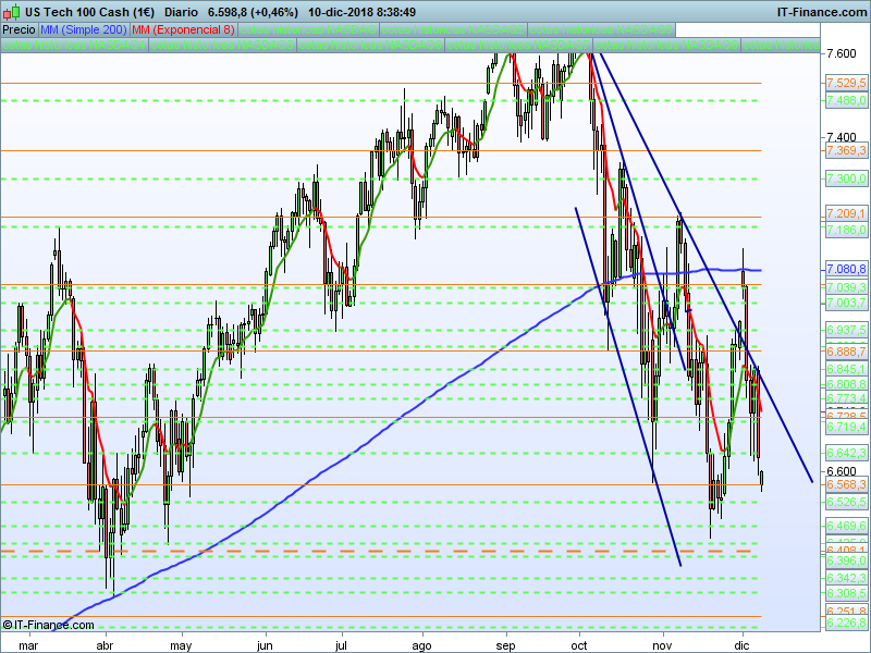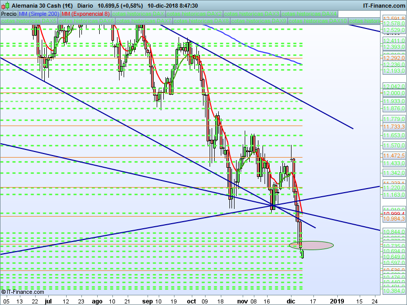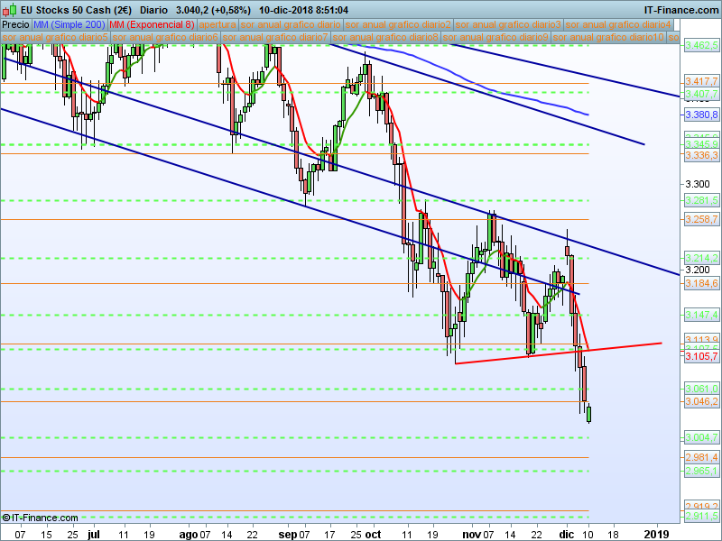 2018-12-10 APERTURA GLOBAL.08:04:54.-Iniciamos una semana más con perspectivas bajistas. Durante la sesión asiática hemos tenido datos del PIB de Japón y han sido horribles, mucho peor de los esperado y eso que las previsiones ya eran bastante pesimistas respecto al dato anterior. Esto hace que los índices a esta hora anden cotizando por debajo de los mínimos de la pasada semana, cosa que tampoco es muy difícil puesto que las velas semanales cerraron en zona de mínimos. Se confirma que el rebote del jueves fue por cancelación de posiciones largas al saltar el stop de los valientes que siguen creyendo en la Navidad. Hay miedo, mucho miedo a una desaceleración económica global, y los datos que vienen de Japón no hacen más que contribuir a ello. Por cierto los últimos datos de inflación de China también son malos.