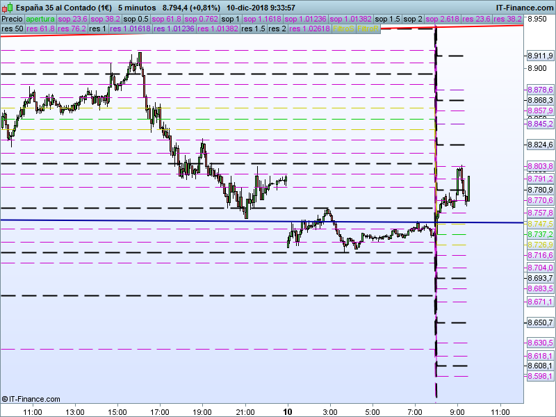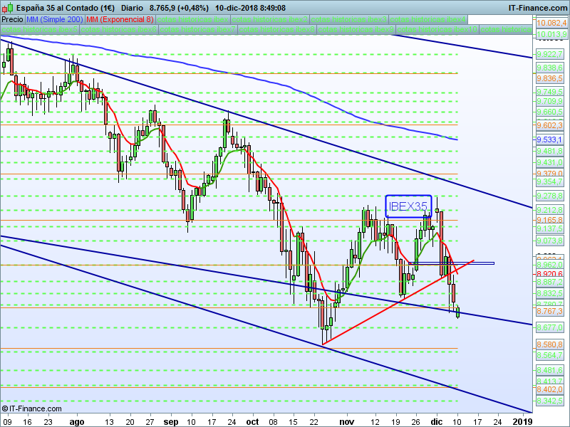 IBEX35,08:48:07. – En estos momentos estamos en el SOR 8767 intentando cerrar el GAP. Si confirmamos cierre por debajo de esta cota, el siguiente nivel objetivo es el 8580, mínimo anual.