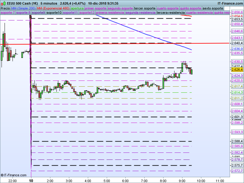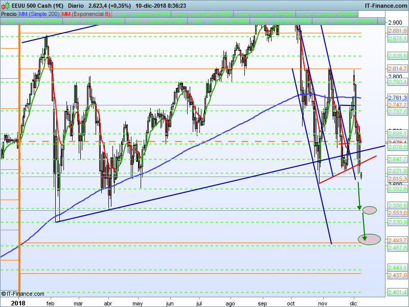 SP500,08:34:29.- Igual que el DOW, apertura con GAP bajista en el SOR 2615. La pérdida de este nivel deja abierto el camino a buscar los mínimos anuales.