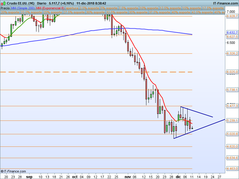 WTI,08:37:20.- Está ofreciendo una corrección compleja, de escasa profundidad y muy zigzagueante tal y como reflejan las mechas de las velas. Ayer marcamos una estructura triangular y no nos vamos a mover mientras no salga de ella.