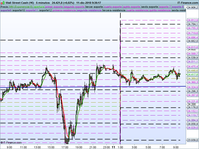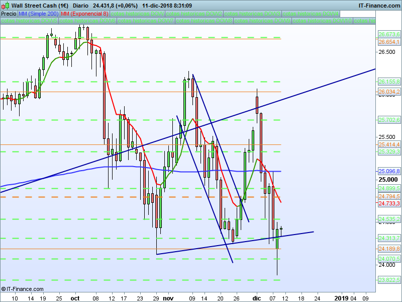 DOW JONES,08:27:57.- Giro alcista justo en el SOR 24189 tras romper el mínimo de Octubre. Por arriba tenemos zona complicada con la media de 200 sesiones y el precio de apertura anual, podemos pensar que mientras el precio siga cerrando por encima de 24189 nos quedaremos lateralizando entre estas zonas.