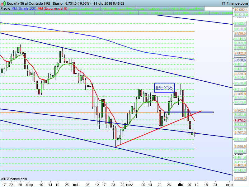 IBEX35,08:45:00. – Vela de indecisión con cierre por debajo del SOR 8767 y sin llegar a perforar mínimos de Octubre. Mientras estemos por debajo del SOR 8962 nuestra predisposición sigue siendo bajista.
