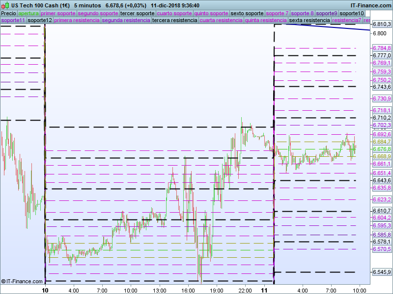 NASDAQ100,08:34:10.- Otro SOR anual que dio soporte al precio en el día de ayer, en este caso el 6568, manteniendo inalterados los mínimos del trimestre. Ojo a la posible formación de un HCH invertido si se van respetando los mínimos de ayer. La zona relevante por la parte de arriba sigue siendo en nuestra opinión el SOR 6888.