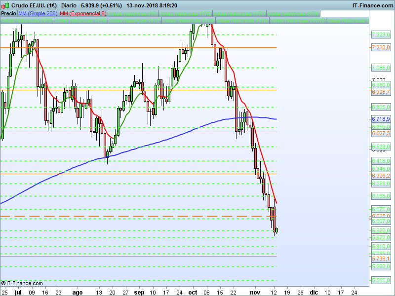 WTI, 08:17:55.- También el WTI muestra una mayor debilidad de la esperada, tras una apertura claramente alcista, el precio se giró y terminó cerrando muy por debajo del PAA. Próximo objetivo SOR 5738
