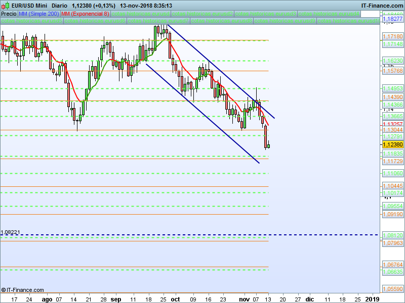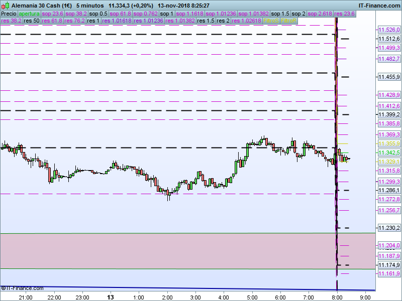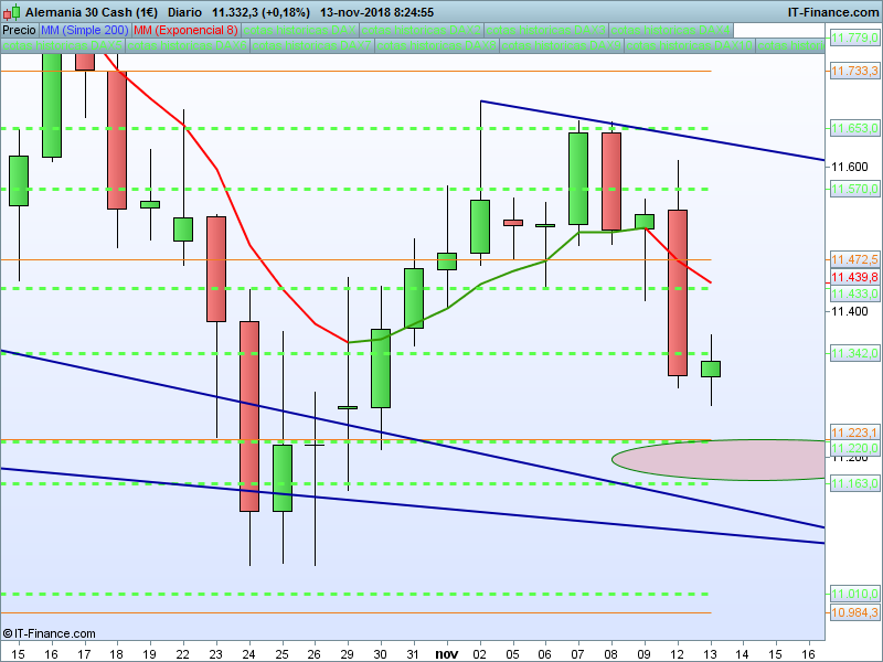 DAX Xetra,08:23:03.- Se llegó a perder un 2.61% desde apertura y finalmente se cerró con descensos del 2%. El objetivo a muy corto plazo es el SOR 11223 y en esa zona nos vamos a jugar el ataque a nuevos mínimos o por el contrario la continuidad del rebote.